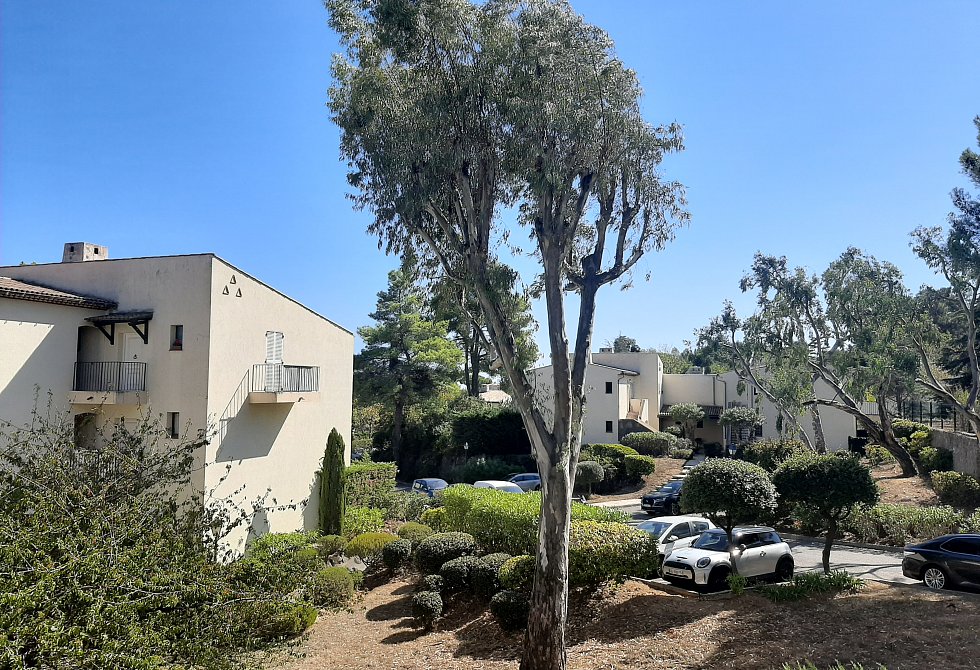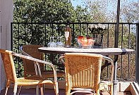 Spise og opholdsafdeling med sofagruppe, der rummer 2 sovepladser. Farve-TV og radio. Udgang til åben øst-vendt balkon med kig til Middelhavet. På terrassen 1 bord og 6 havestole samt parasol.