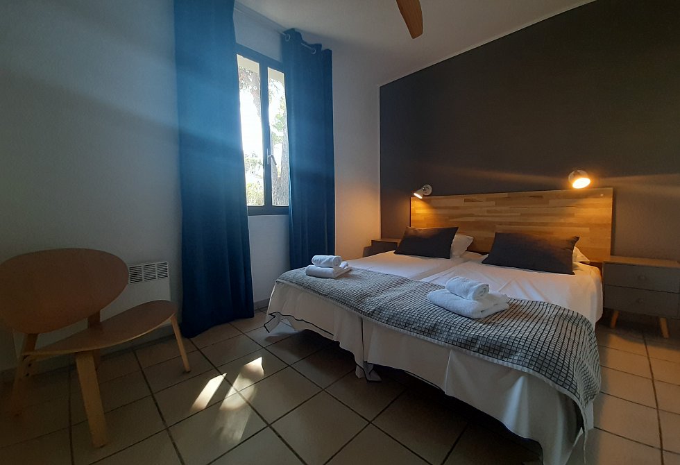 2 sovepladser, skab. Direkte adgang til brusebad.