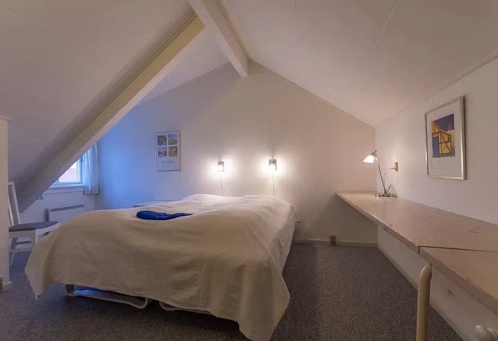Entré, stue med køkken, bad og toilet forneden og soveværelse ovenpå. Der er 4 sovepladser - dobbeltseng i stort lukket soveværelse på hems og smallere dobbelt sovesofa i stue.